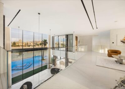 Upstairs, the right wing hosts an additional bedroom, while the left wing offers a study and the master suite, complete with a walk-in closet and a luxurious en-suite bathroom. The villa also includes a private cinema, gym, elevator, and two living rooms, perfectly suited for modern family living and entertaining.