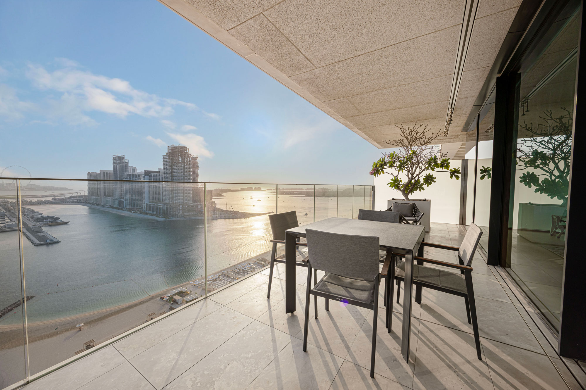 - Panoramic dual views: Marina, Ain Dubai, Harbour, Palm, Burj Al Arab, Burj Khalifa